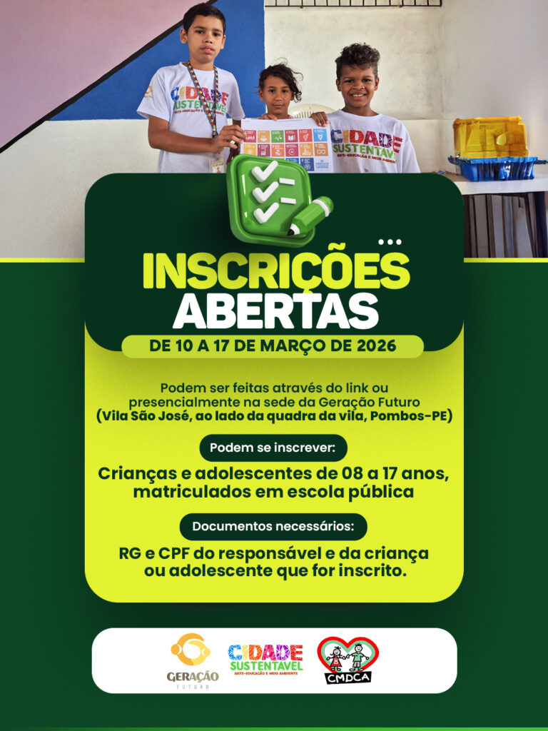 As inscrições para o novo ciclo do Projeto Cidade Sustentável: arte-educação e meio ambiente estão abertas entre o período de 10 a 17 de março, presencialmente na sede da Geração Futuro, na Vila São José, ao lado da quadra da vila, Pombos-PE, das 8h às 15h.