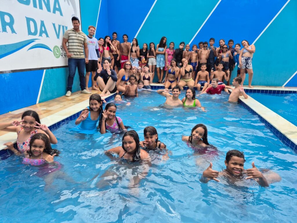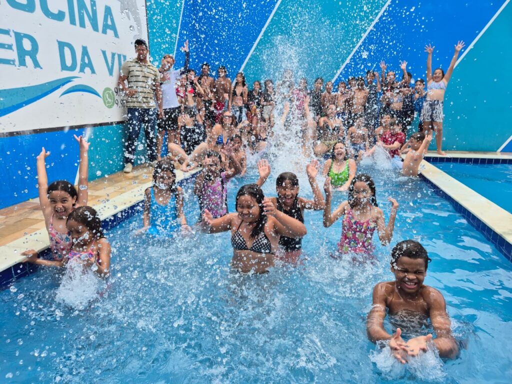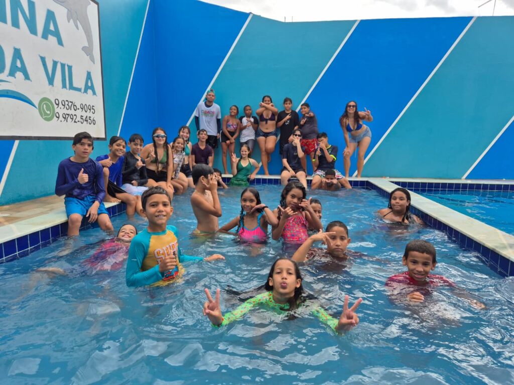 As crianças e adolescentes do Projeto Cidade Sustentável: arte-educação e meio ambiente, participaram da confraternização do projeto na piscina Lazer da Vila, em Pombos-PE. Aproveitando a chegada do verão, as crianças e os adolescentes se reuniram para celebrar as conquistas e avanços registrados durante os 10 meses de projeto com muita diversão na água, antes da pausa para as festividades de fim de ano.