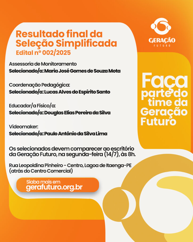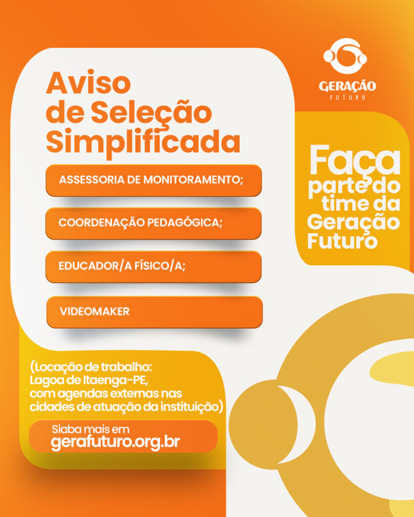 As vagas são para início imediato com atuação no escritório da Geração Futuro em Lagoa de Itaenga-PE, com agendas externas nas cidades de atuação da instituição. O edital de número 002/2025 pode ser consultado abaixo.