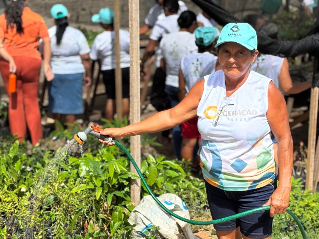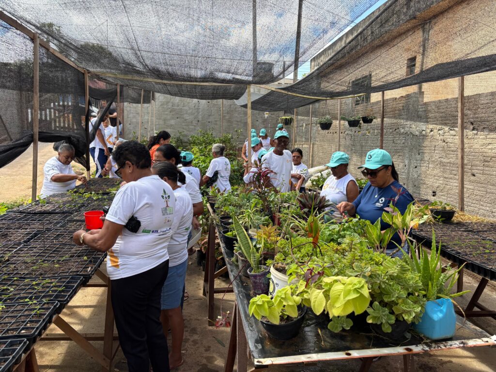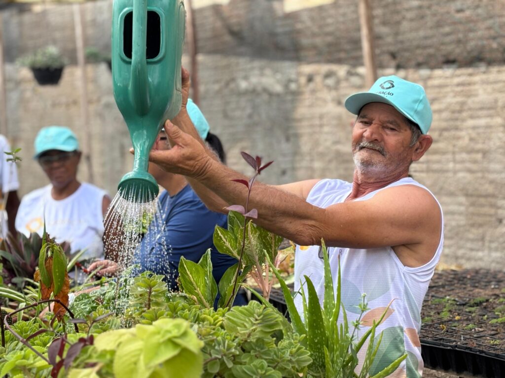 Na atividade de horticultura, as pessoas idosas colocaram em prática as informações sobre preparo do solo e plantio de frutas e hortaliças, recebidas no período da formação em Agentes de Desenvolvimento Ambiental. Eles observaram o desenvolvimento das espécies presentes no Viveiro de Mudas e tiraram dúvidas com o mobilizador de campo, Wemerson Barbosa.