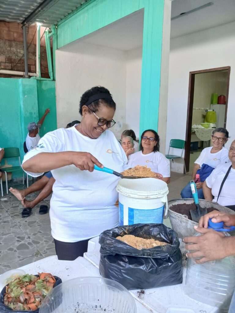 Na formação, as pessoas idosas também colocam a mão na massa para fazer a compostagem e são orientadas a repetir o processo em casa. As aulas foram ministradas pelo mobilizador de campo Wemerson Barbosa, para o grupo de Nossa Senhora do Ó, Ipojuca, no litoral sul de Pernambuco, e pela educadora ambiental Siomara Elis, para os grupos de Jaboatão dos Guararapes e Vitória de Santo Antão.